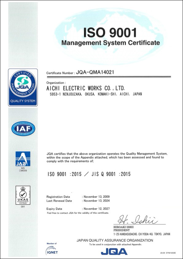 We obtained the quality management system ISO 9001 certification on November 13, 2009.